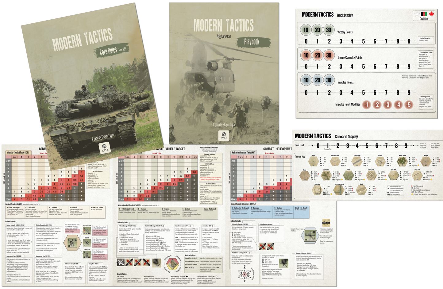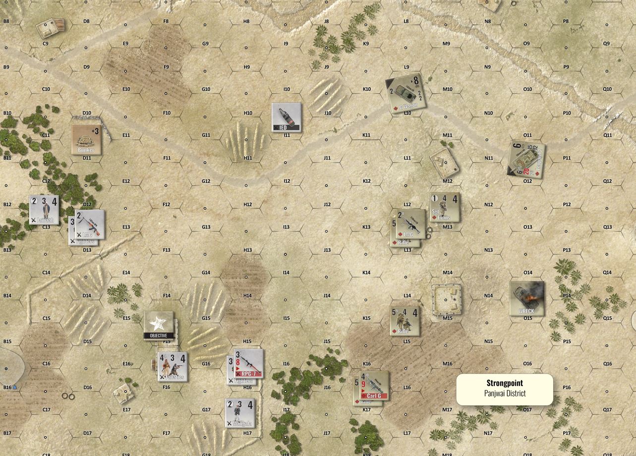 Scenario & theater playbook (Afghanistan) • Core rules (v1.0) • Geomorphic tactical maps • Coalition and Insurgent counters (infantry, leaders, weapon teams, vehicles, markers) • Player aids and reference tables.