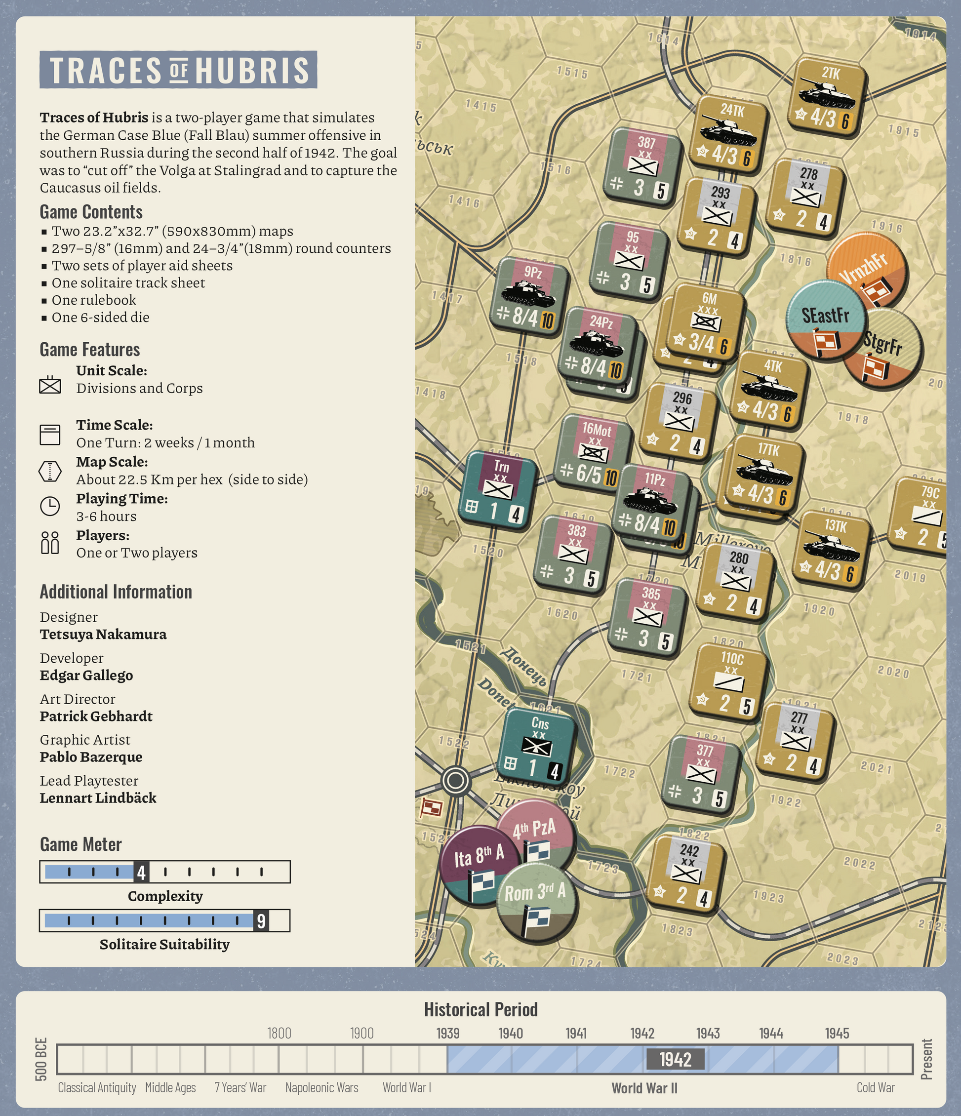 Traces of Hubris is a two-player game that simulates the German Case Blue (Fall Blau) summer offensive in southern Russia during the second half of 1942. The goal was to “cut off” the Volga at Stalingrad and to capture the Caucasus oil fields.