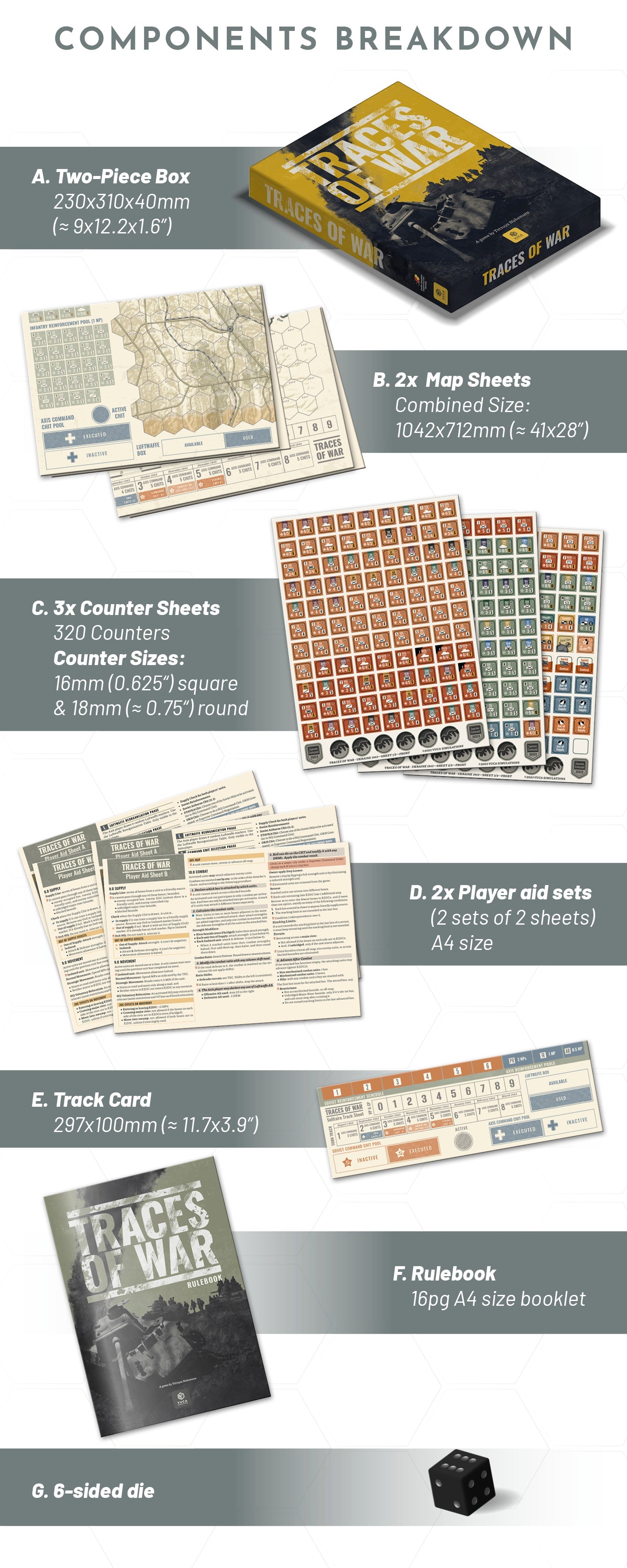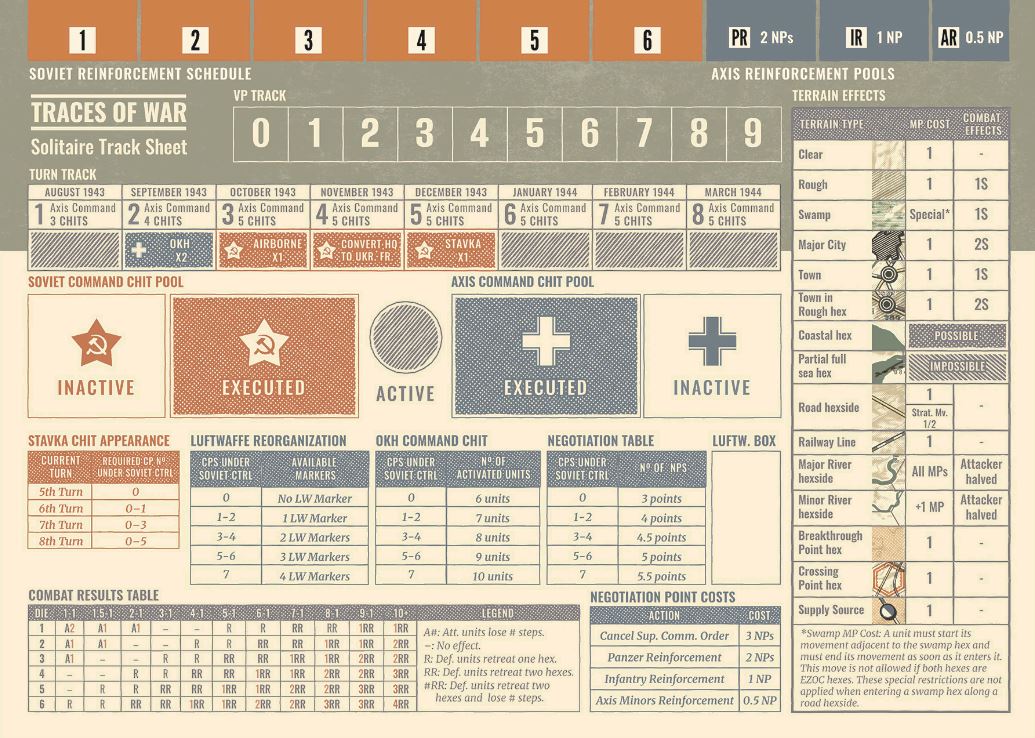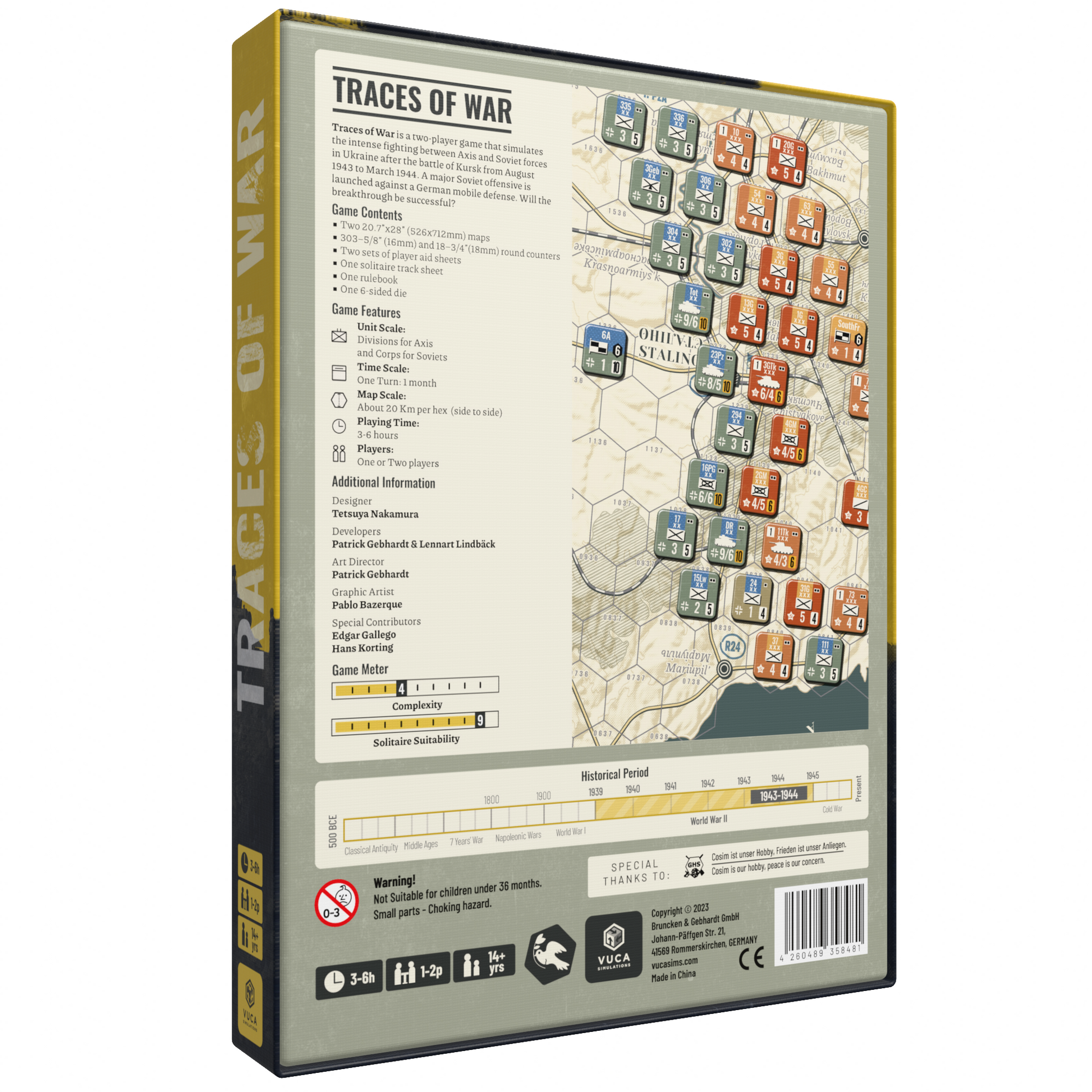Traces of War is a two-player game that simulates the intense fighting between Axis and Soviet forces after the battle of Kursk during August 1943 to March 1944. A major Soviet offensive is launched against a German mobile defense. Will the breakthrough be successful?